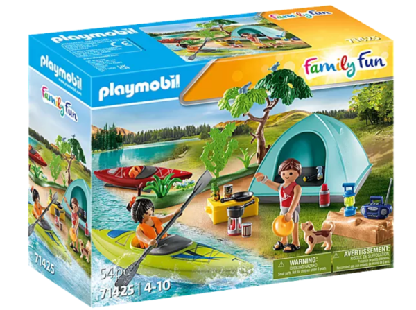 Ein sommerlicher Tag auf dem Campingplatz – die Familie macht es sich vor dem großen Zelt gemütlich, isst gemeinsam und genießt den gemeinsamen Urlaub.